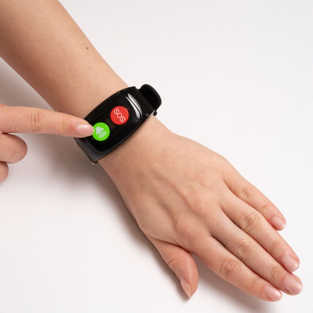 Durch Drücken der SOS-Taste wird sofort ein Alarm ausgelöst und Hilfe gerufen, wobei die integrierte GPS-Ortung den genauen Standort des Trägers mitteilt.
