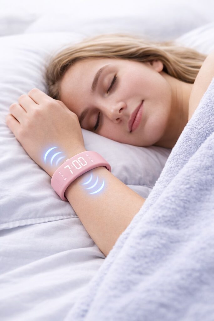 Sie legen die Uhrzeit fest. Zur eingestellten Zeit erzeugt das Armband einen spürbaren Vibrationsimpuls am Handgelenk – ohne akustisches Signal. So werden Sie zuverlässig geweckt, ganz ohne Klingeln – ein Alarm direkt am Handgelenk, wie bei einer schlichten Armbanduhr.